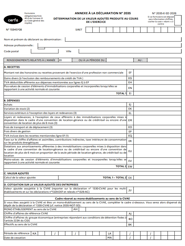La valeur ajoutée produite pendant l’année est déterminée sur le tableau n° 2035-E inclus dans votre déclaration de résultats n° 2035.