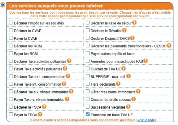 Pour cela, rendez-vous dans la rubrique “Gérer” puis Services en ligne > Adhérer aux services en ligne > Renseignez votre numéro SIREN (9 chiffres). Enfin, sélectionnez “Franchise en base TVA UE” dans la liste des services proposés :